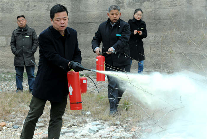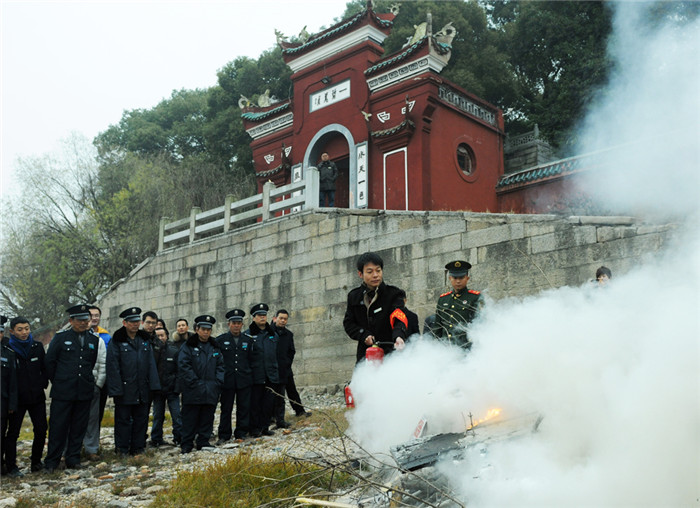 12月26日上午,岳阳楼景区保安人员和义务消防队员近60人整装集合,在岳阳楼消防大队教官的指导下进行了2014年冬季消防灭火演练。9点,岳阳楼东广场哨声响起,景区保安员和来自各工作岗位的义务消防队员们紧急集合整队。岳阳楼消防大队教官首先进行示范操作,进行了消防知识和基本操作技巧的授课,然后是队员们的单独训练。半小时后,景区临湖岸边突冒浓烟,队员们迅速转移阵地,大家有条不紊轮番上阵,几分钟内火源被扑灭。